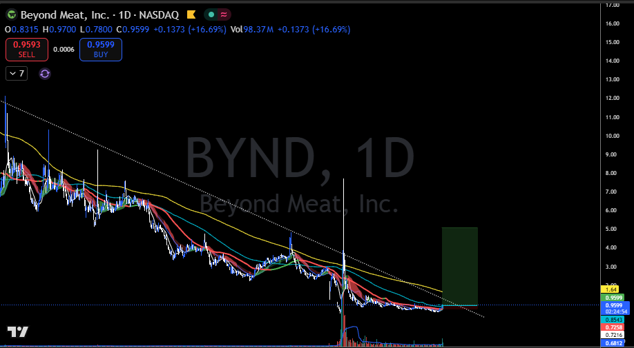 It’s literally screaming it’s about to go back to $2. BYND actually starting to wake up again main level everybody should be watching is $2 if this thing can break over $1.5 -$2 and actually hold it not just wick over and die then the next real spot is around $3.5 thats the level where it gets serious to me because if it pushes through 3.5 with strong volume and real buying behind it then this can move way faster than people think after that yeah i think double digits starts getting put back on the table especially if momentum traders pile in and volume stays heavy not saying its guaranteed and not saying go all in or anything like that but the setup is there $1.5 -$2 is the first door 3.5 is the real wall break that clean and this gets very interesting very fast...